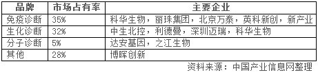 目前国内IVD 细分市场上,免疫诊断和生化诊断诊断是两块最大的市场,其在IVD(试剂)的市场占比分别为35%和32%,对应的市场规模大约为42 亿元和38 亿元。这两块最大的细分领域目前市场处于比较分散的状态,国内龙头企业实力相当。市场规模相对比较小的领域,市场集中度比较高,比如分子诊断领域,龙头企业达安基因的优势明显;在微量元素检测领域,博晖创新的市场份额达到60%。