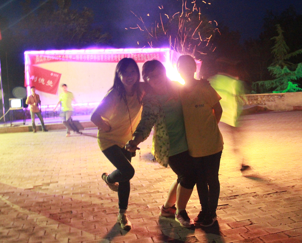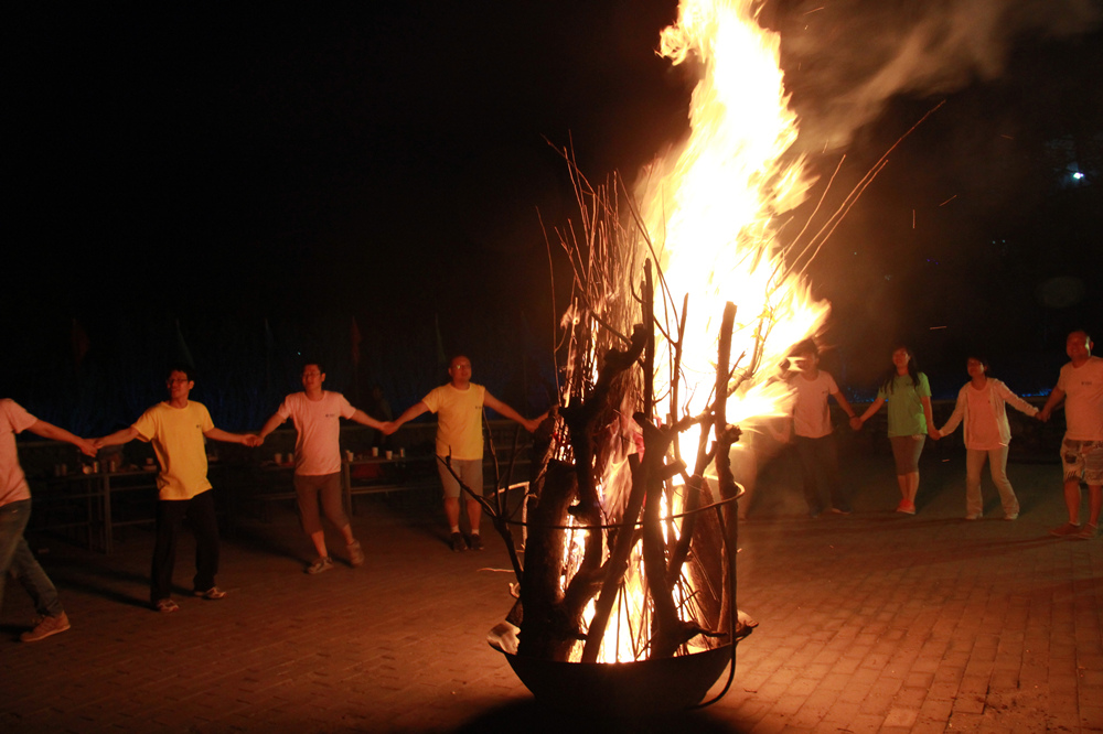 夜幕降临,星光依稀,篝火燃起。大家手拉手圈成圆,围着烈焰,传递香醇啤酒,伴着音乐舞动起来。三支队伍先后展示了团体节目,黄队的“时尚情侣T台秀”、粉队合唱《五环之歌》、绿队的《精忠报国》合唱伴劲爆双节棍,尽现风采。最后,教练带领三支队伍体验“前方打仗,后方支援”的脑筋急转弯游戏,跌宕起伏的故事情节充分调动了队员们的想像力和积极性,简直乐翻天,意犹未尽地结束了美妙的一天。