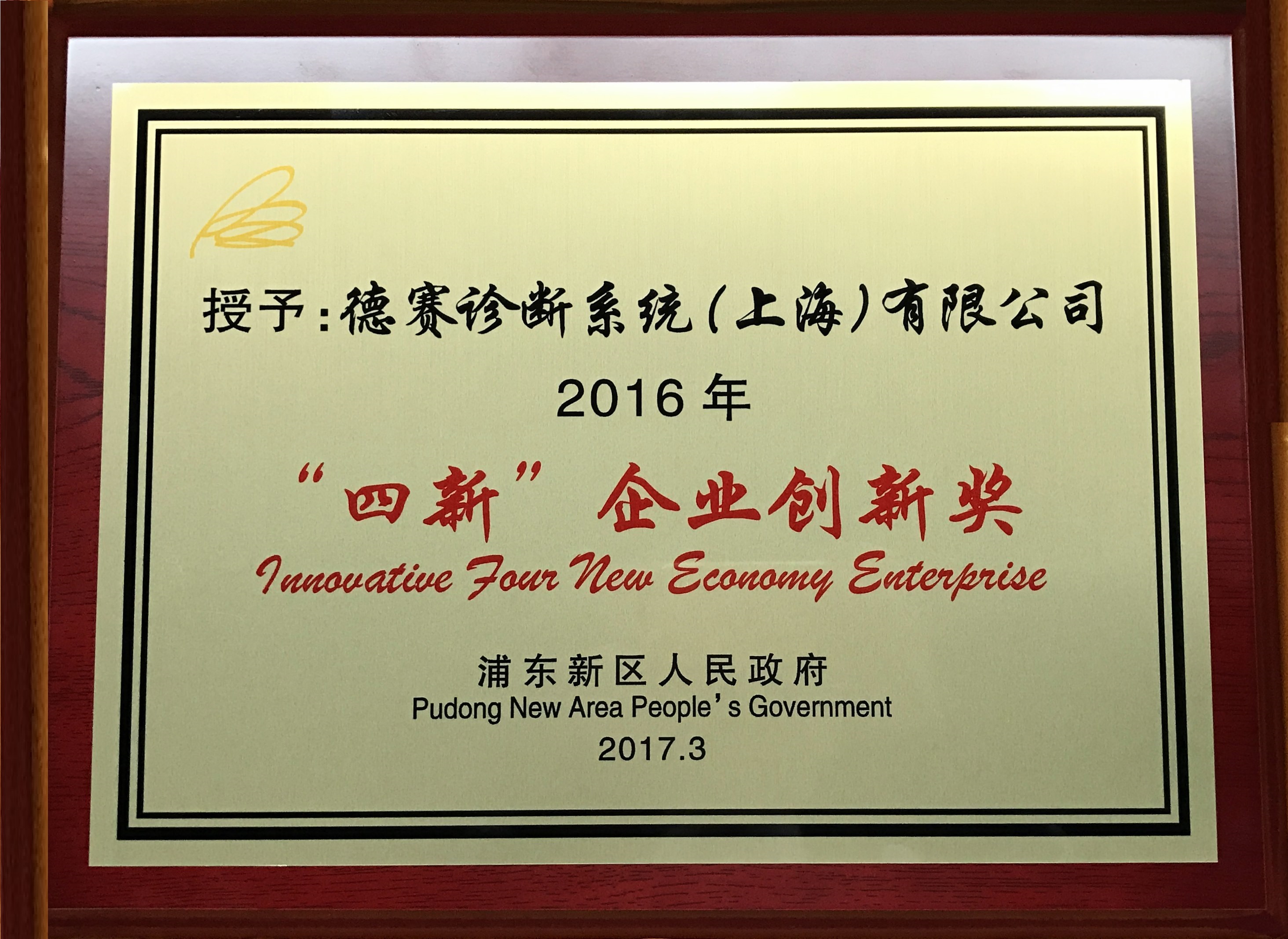 vkgame威客电竞(中国)有限公司子公司德赛诊断荣获上海市浦东新区2016年“四新”企业创新奖