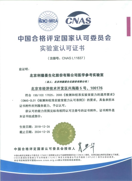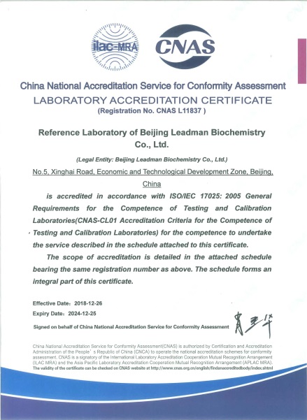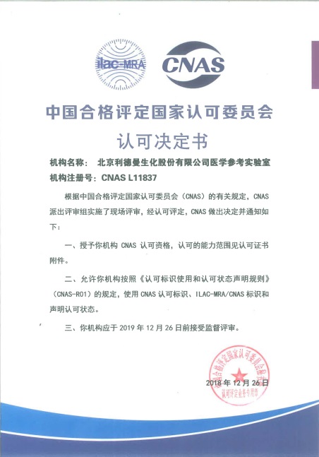 参考实验室于2018年8月向CNAS提交认可申请,9月通过文审,CNAS评审专家组于11月10日-11月11日对vkgame威客电竞(中国)有限公司参考实验室进行现场评审。经过审核文件、现场检查、现场实验等方式的审查,CNAS评审专家组一致同意通过现场评审。参考实验室于2018年12月26日获得CNAS参考实验室ISO17025和ISO15195的认可证书,认可范围包括ALT、AST、GGT、ALP、AMY、CK、LDH七个酶学参考测量程序。